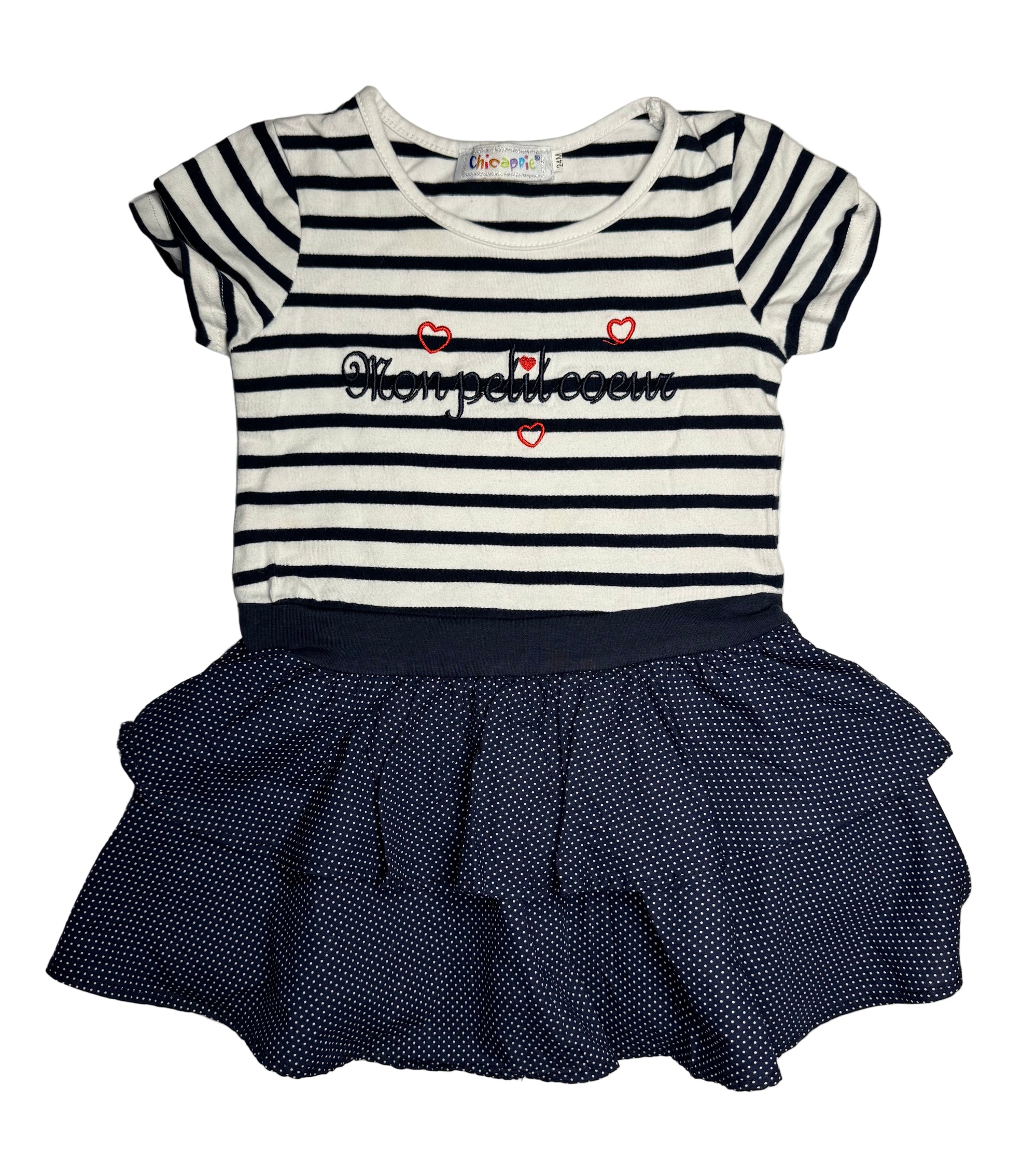 • Breton stripe top with “Mon petit cœur” embroidery and heart details
