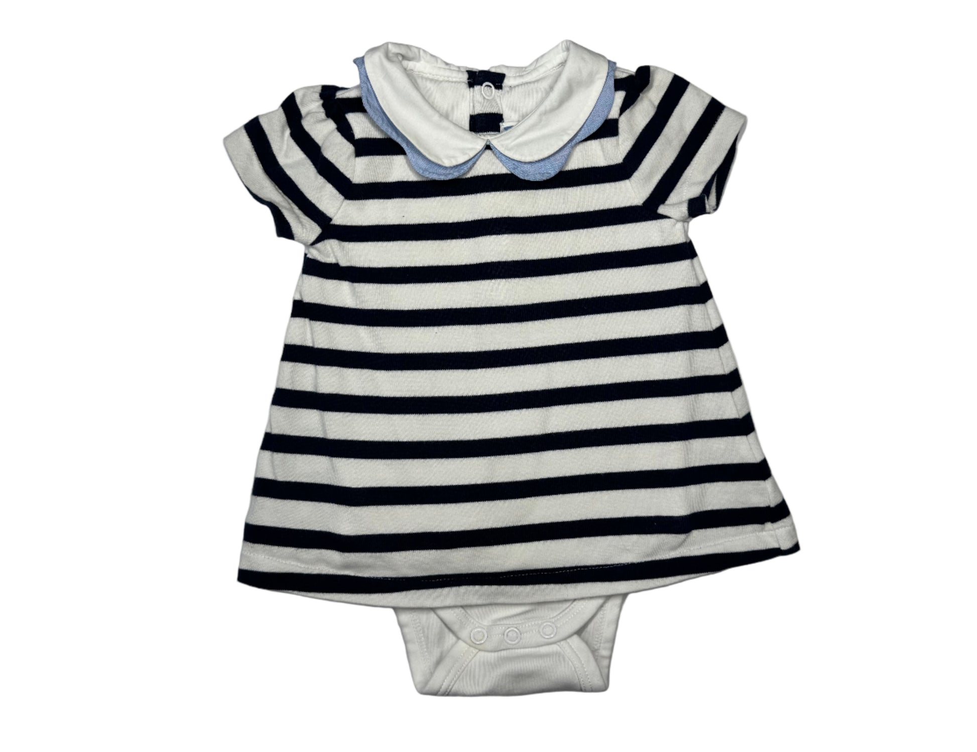 Colour: Navy and white stripes with contrast pale blue Col Claudine collar
