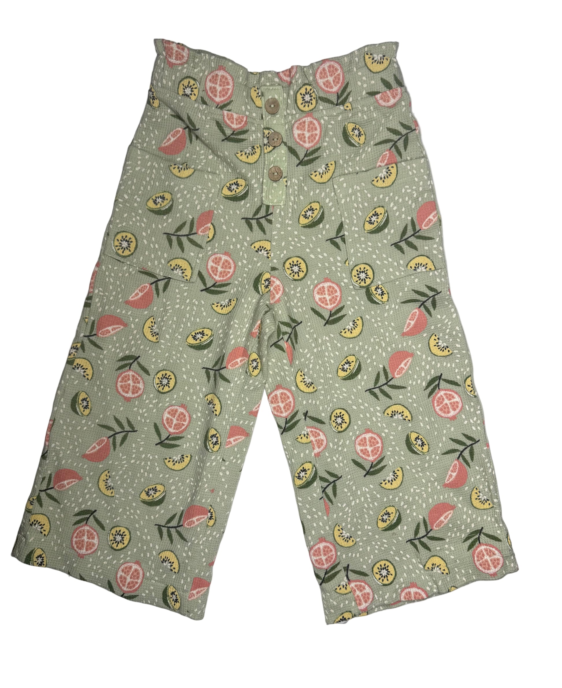 Colour: Soft sage green with playful fruit print in pink, yellow and green