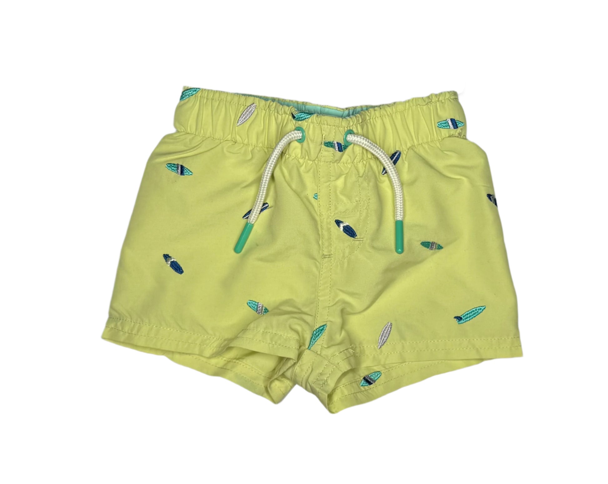 Colour: Vibrant lime yellow with multicolour surfboard embroidery