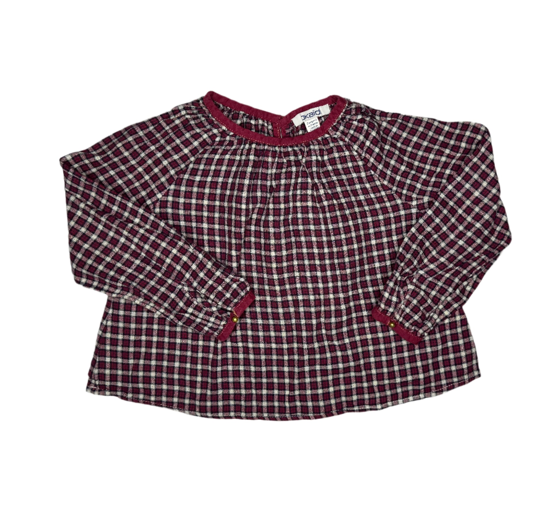 • Burgundy trim at neck and cuffs with delicate brass button detail