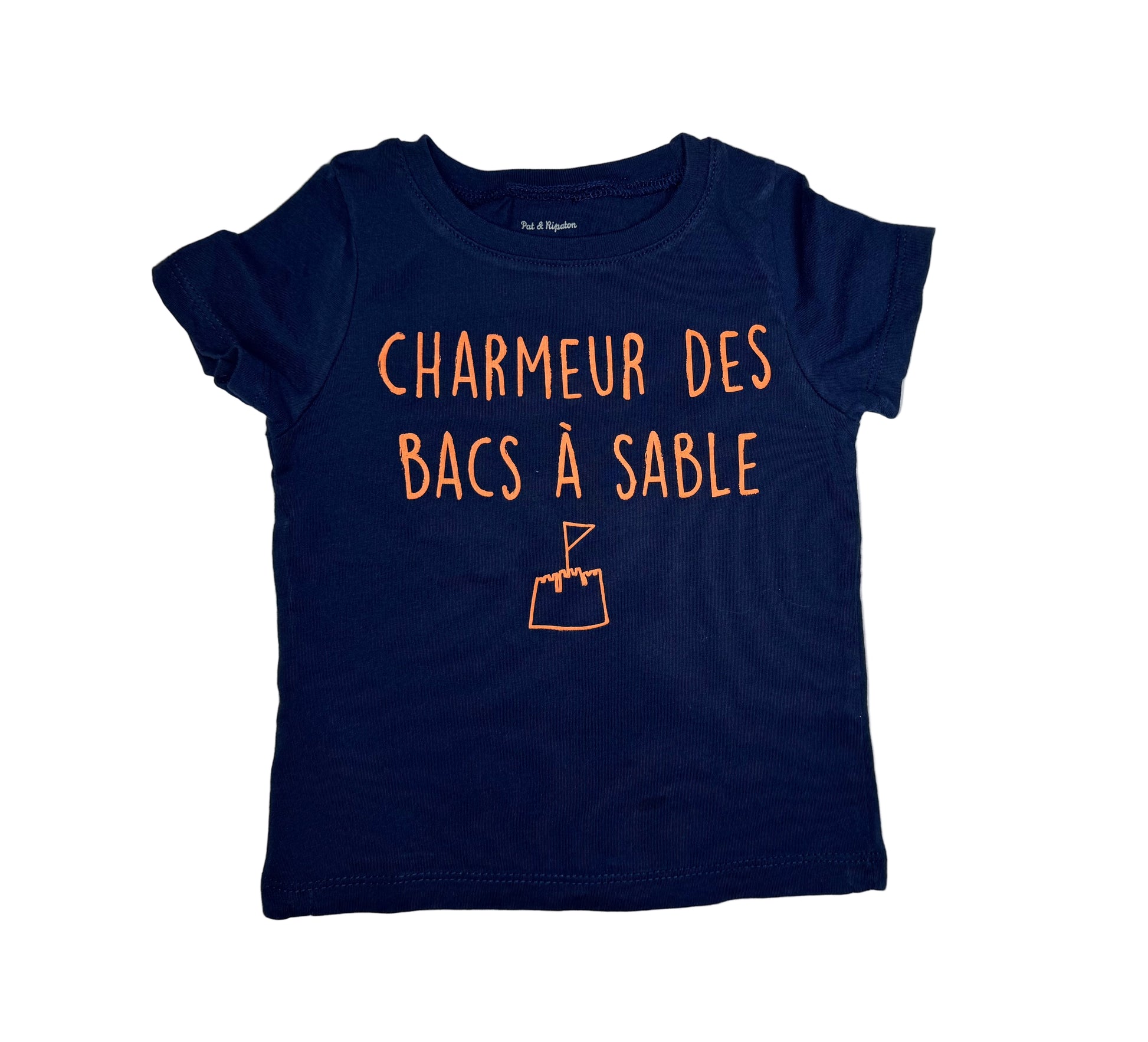 • Fun French slogan “Charmeur des bacs à sable” (Sandpit charmer)